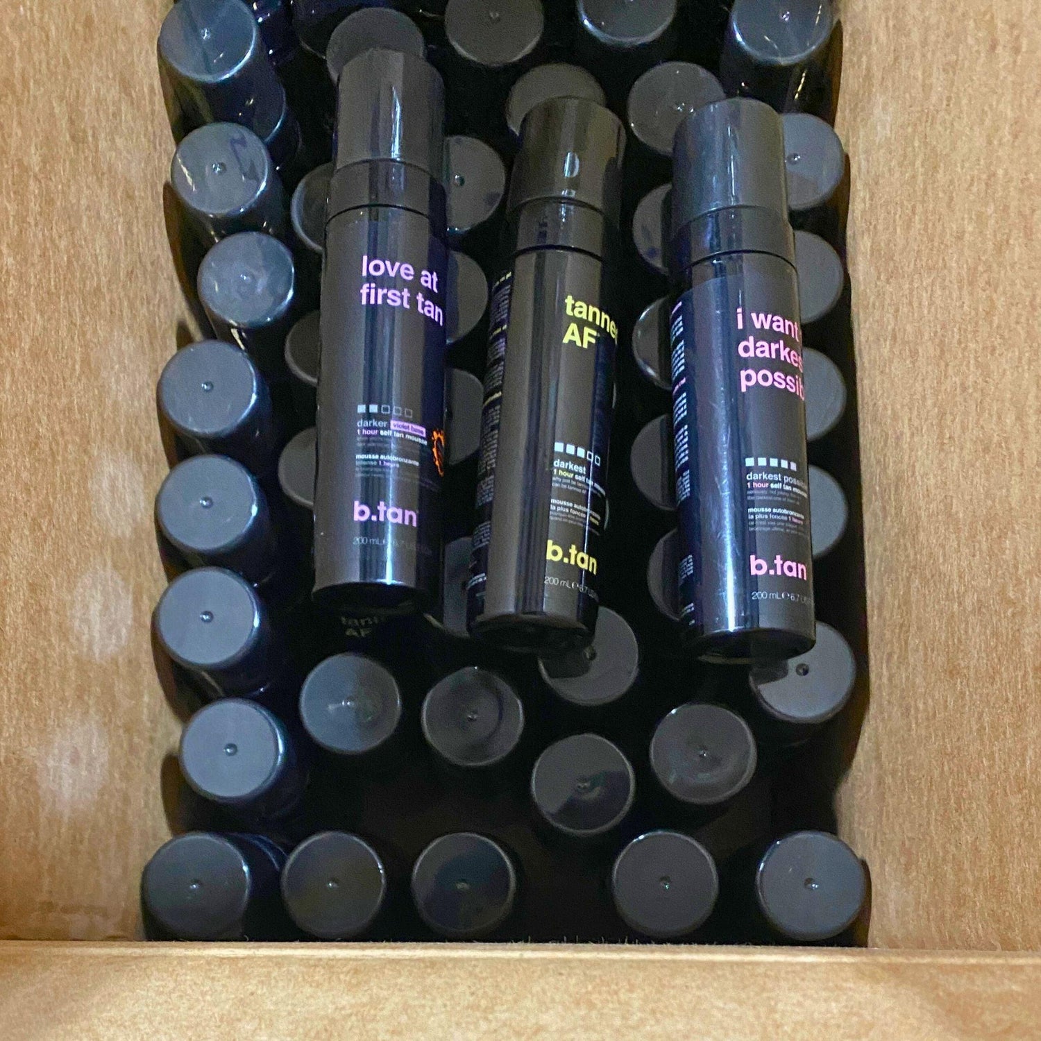 Enhance your inventory with B.Tan Assorted Self-Tan Mousses, featuring popular formulas like Love at First Tan (darker violet base), Tanned AF (darkest), and I Want the Darkest Tan Possible (darkest possible). This lot of 50 pieces offers 1-hour, 6.7 fl oz tanning solutions loved by beauty enthusiasts for their fast results and rich tones. Perfect for resellers looking to attract beauty-conscious customers!